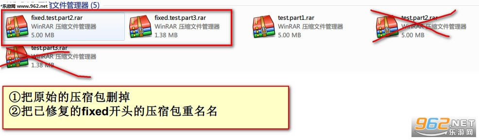 ④修复完成后可以看到目录下多了两个fixed开头的压缩包,把原part2和part3删掉,fixed开头的重命名为原来的