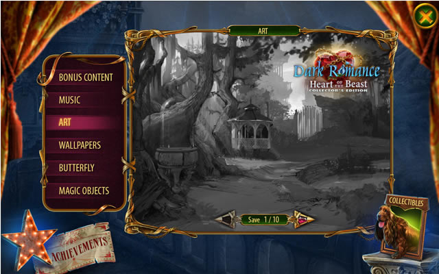 | 《黑暗罗曼史2:野兽之心》的基础玩法属于典型的看图找物类游戏,在继承前作的玩法的基础上,加入了大量全新的小谜题,全新的剧情、精美的画面和引人入胜的音乐,让本作有着非常高的可玩性。 【游戏介绍】《黑暗罗曼史2:野兽之心(Dark Romance 2: Heart of the Beast)》是由Domini Games制作,Big Fish Games发行的一款解谜游戏,在游戏中玩家分饰两角——女主碧翠丝和男主乔纳森,女主要从女巫手中夺回玫瑰之心用来救治他病种的父亲,男主则要打败女巫拯救自己的国家,同样的目标又将使这对男女碰撞出怎样的火花呢? 【故事背景】女主碧翠丝的父亲已经病入膏肓,只有一个办法可以挽救他的生命,那就是万灵之花——生命玫瑰!为了不失去她的父亲,勇敢的碧翠丝按照他所述的方向向一个遥远国度出发,那里的国王陛下就是生命玫瑰的拥有者! 历经千辛万苦,终于碧翠丝抵达了遥远国度的国王城堡门口,而就在这时她目睹了一个老妖婆抢先占有了玫瑰!原来老妖婆为了永远青春貌美,对国王和他的臣下施了魔法,大臣们变成了动物,而国王被拉到了马戏团…… 【典藏版内容】从克劳丁的手下解救乔纳森和他的子民